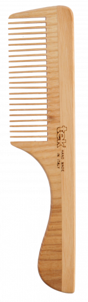 Uniwersalny, antystatyczny, ręcznie wyrabiany, drewniany grzebień z uchwytem ma doskonale zaokrąglone cienkie zęby, które delikatnie rozczesują i rozdzielają włosy jednocześnie delikatnie masując skórę głowy. Wykonana z jesionu. Obudowa lakierowana. Wymiary: 19,5 x 4,5 cm.